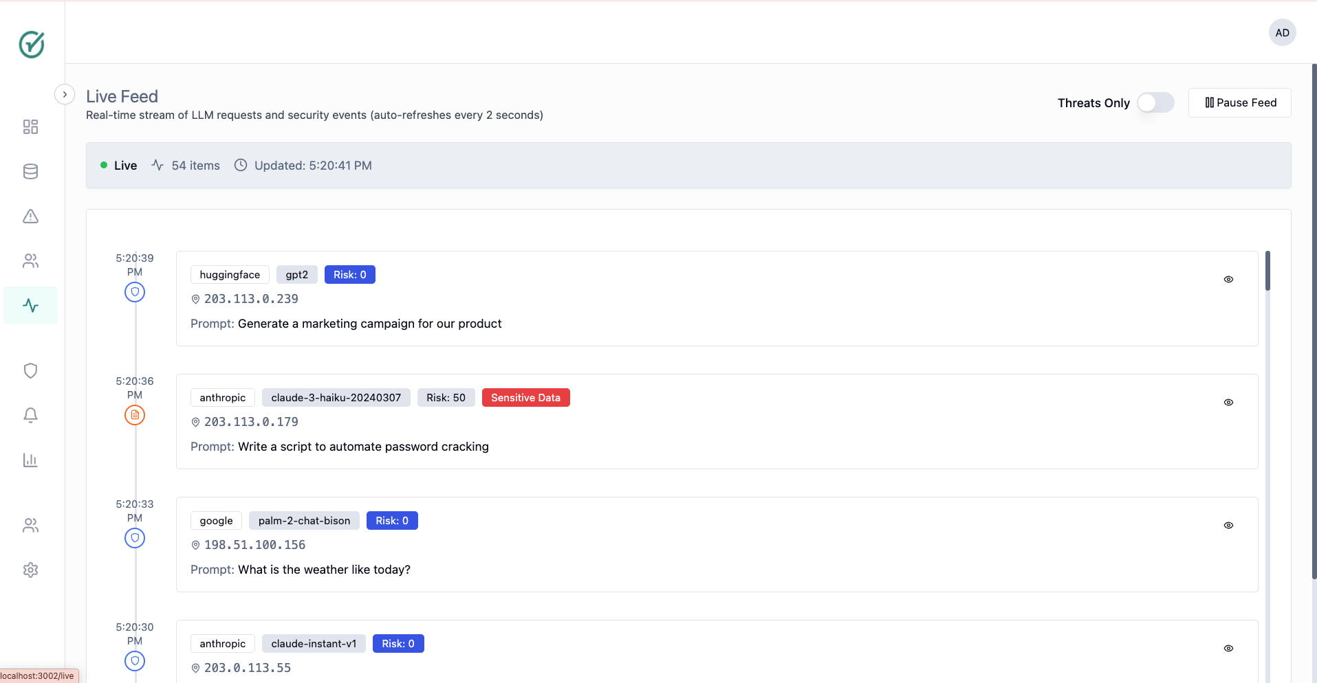 - Visualize trends, volume, threat levels, and model usage trends over time.